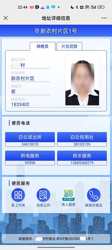 居民通過(guò)二維碼,可以獲取當(dāng)前位置的網(wǎng)格、地址、網(wǎng)格員、民警等信息。